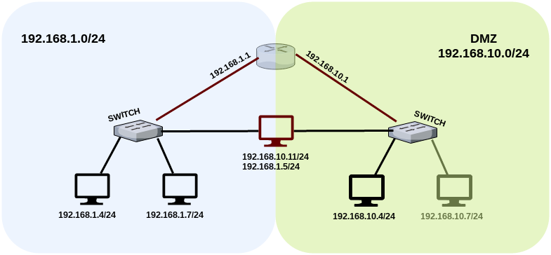 As seen in the above topology, the device that has two NICs has access to the both 192.168.1.0/24 and 192.168.10.0/24 networks. Under normal circumstances there is no access between these two networks -unless a routing rule is defined. According to this structure, the authorized user, who is using the computer with two NIC cards, has to access some services in the DMZ.