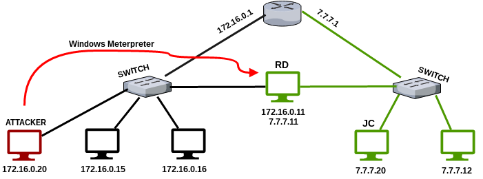 According to our scenario, the attacker who gains access to the RD system will want to access the network with the second NIC (7.7.7.0/24). The attacker must first define the routing rule on RD to do this operation.